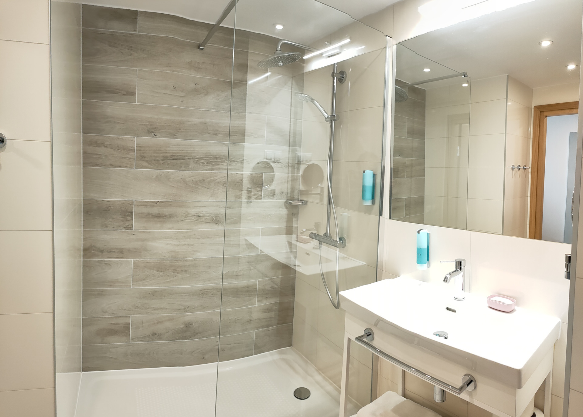 cabina de ducha, secador de pelo, toallas, lavabo, inodoro, calefacción por suelo radiante.